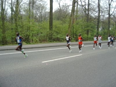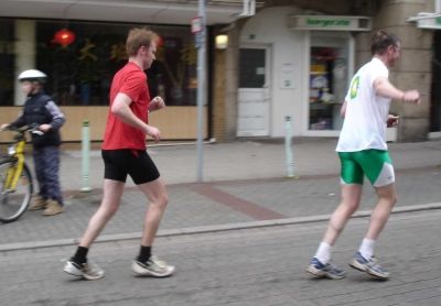 hinten im Bild, hinter der kleinen Läuferin, Michael Terhorst (grünes Trikot) und der Marathon-Depütant Matthias Boland (rotes Trikot) kommen den Ziel Schritt für Schritt näher.